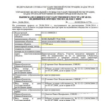 Вот, выписка из реестра. Особое внимание на 3 строчку — «земли сельскохозяйственного назначения». Ну и чуть ниже — Сорокин Олег Валентинович, мэр Нижнего Новгорода, доля в праве на участок 12/20.