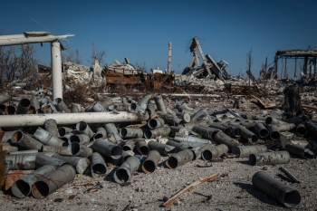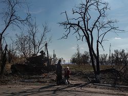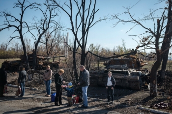 03. Люди стоят на автобусной остановке, у которой были укрепления украинской армии в какое-то время, до того, как ее разбомбили