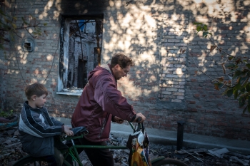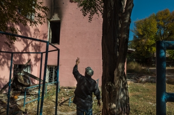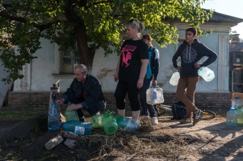 12. В городе нехватка воды, много разрушенных зданий — школа, супермаркеты. Не работает система отопления и водоснабжения, люди выстраиваются на очередь у колодцев или колонок, в некоторые районы приезжает грузовик с водой.