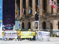 В минувшие выходные, 15 и 16 ноября, последователи Фалуньгун держали свои транспаранты на обочине дороги, по которой кортеж Си направлялся из отеля на саммит. Затем в понедельник, 17 ноября, они провели акцию протеста возле здания парламента в Канберре. На баннерах протестующих было написано «Фалунь Дафа несёт добро».