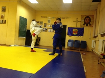 В одноэтажной пристройке к церкви все оборудовано для занятий спортом: боксерские груши, маты на полу. Но на стенах в несколько рядов висят иконы и дипломы с соревнований. Под большим ликом Христа — флаг клуба с надписью: «За други своя». «Нет больше той любви, чем как то отдать жизнь свою за други своя», — цитирует девиз клуба его руководитель Виктор Васильев. Этот невысокий, крепкий лысый мужчина — бывший инструктор по боевой подготовке ОМОНа. Тоже воевал.
