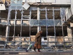 Это уже обычная для окраин Донецка картина — снесенные крыши, разрушенные стены, болванки от «Градов», торчащие из газонов и асфальта, молчание и пустота улиц. В картине Петровского района — он на отшибе к западу от центра — присутствуют еще и люди. Можно встретить мам с колясками — жен шахтеров с «Трудовской», старух, торгующих яблоками с ведра. На разнесенной снарядами площади у автостанции дежурят три маршрутных «пазика». Вокруг разрушено почти все, но три «пазика» стоят как ни в чем ни бывало.