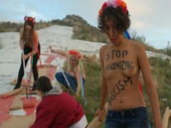 Однако на этот раз участницы Femen решили помешать памятным мероприятиям, отмечает агентство meganovosti.info. Акцию под лозунгом: «Stop 20N – остановим канонизацию фашизма!» они провели, по традиции обнажив торс и расписав грудь антифашистскими призывами. Кроме того, активистки разрисовали в технике граффити подножие гигантского белого креста, установленного на месте казни республиканцами как минимум 2 тыс. испанских повстанцев, перед тем, как силы Франко добились победы в гражданской войне 1936-39 годов.