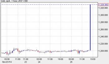 Не удивительно, что ошибка трейдера, которая на азиатских торгах 26 ноября спровоцировала стремительный рост золота с $1200 за тройскую унцию до $1460 за тройскую унцию, сразу стала источником для новой порции версий в стиле «теорий заговора».