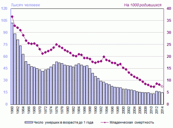 Число умерших в возрасте до 1 года (тысяч человек) и коэффициент младенческой смертности (умерших в возрасте до 1 года на 1 родившихся живыми), 1960-2014* годы http://demoscope.ru/weekly/2014/0611/barom05.php
