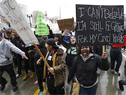 Акции протеста начались в Фергюсоне 24 ноября после того, как жюри присяжных решило не выдвигать официальных обвинений против полицейского, застрелившего 18-летнего подростка в августе 2014 года. Демонстрации прошли во многих городах страны. За три ночи было арестовано около 400 человек. Президент США Барак Обама заявил, что насилие не имеет оправдания и зачинщики погромов будут наказаны.