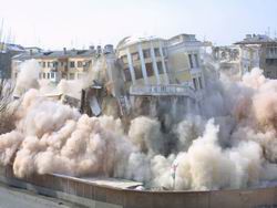 Мы выезжаем из частного сектора, минуем разрушенную церковь, принявшую на себя значительную часть ударов. И оказываемся в районе девятиэтажек, зияющих черными, обгоревшими дырами. Под ногами хрустят мелкие осколки оконных стекол. Люди подготавливают бомбоубежище, обустраивая подвал своего дома. Все ждут новых обстрелов. Детская площадка изрыта ямами от падения снарядов, а детские горки и лесенки продырявлены осколками.