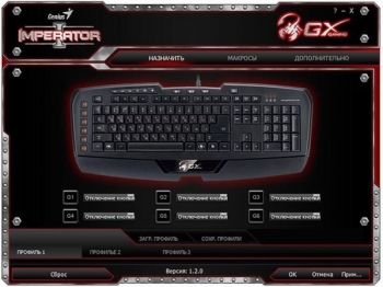 «Император» поставляется с фирменным программным обеспечением Imperator Driver Setting, записанным на компакт-диск. Там же можно найти электронную версию инструкции по эксплуатации, полезностью которая не отличается. В том случае, если в вашем ПК нет оптического привода, ПО можно скачать с официального сайта Genius, но только с международного — зеркало в Рунете содержит лишь ознакомительную информацию об устройствах. Мы в этом убедились на собственном опыте. Интерфейс программы Imperator Driver Setting очень сильно напоминает дизайн самой клавиатуры, то есть он не менее стильный. Утилита позволяет настроить кнопки G1 — G6 на выполнение различных команд, причем на каждую можно назначить до трех действий — по одному на профиль.