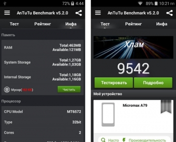 Встроенная память разделена на два раздела примерно пополам. Для приложений выделен раздел объемом 1,27 Гб, из которых доступно около 1 Гб. Раздел для пользовательских данных чуть меньше — 1,18 Гб. Свободной оперативной памяти для сторонних приложений всего чуть больше 100 Мб, остальной объем используется системой. Программа Antutu сообщает, что устройство набрало 9542 балла по результатам тестом. Впрочем, в данной ценовой категории результаты других участников будут примерно такими же.