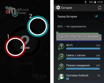 Дисплей смартфона имеет разрешение 480х800 при диагонали 4 дюйма, что уже фактически минимальный размер на данный момент среди смартфонов на Android. Углы обзора невелики, но цветопередача в целом нормальная для устройств начального сегмента. Присутствует функция автоматической регулировки яркости, однако, к сожалению, диапазон регулировки невелик. Тачскрин поддерживает всего два касания, отзывчивость сенсора в целом хорошая. Под дисплеем расположены три сенсорные кнопки без подсветки.