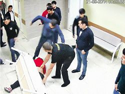 Сцена убийства в больнице. Тридцать человек бьют одного, вытаскивают за ногу в холл, сверху бросают лавочку… Съемка камеры видеонаблюдения. В кадре: охранник пытается утащить Анатолия. Фото: съемка с камер наблюдения.