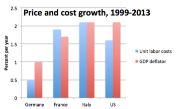 В качестве примера для сравнения автор статьи берет Францию. Ее часто ругают за потерю конкурентоспособности, но у страны все не так плохо, как может показаться: у нее скромный дефицит торгового баланса, а ее дефлятор ВВП с 1999 года (введение евро как валюты) в среднем рос на 1,7% в год, что, во-первых, меньше роста удельных затрат на рабочую силу (1,9%), а во-вторых, близко к поставленным ЕЦБ целям (чуть менее 2%). В Германии же цены и затраты на рабочую силу увеличивались на 1% и 0,5% соответственно.