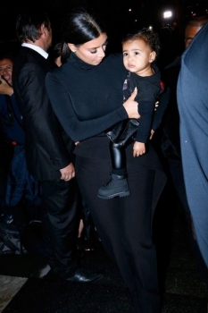 Выбор Ким еще раз подтверждает, что простая черная водолазка выигрышно смотрится на любых фигурах, красиво подчеркивая грудь и талию. Однако в данном случае не совсем понятен выбор брюк с весьма странным декором по линии верхнего среза. Завышенная линия талии зрительно вытягивает силуэт, однако абсолютное совпадение оттенков не играет в пользу баски на брюках — в первого взгляда не очевидно, к чему относится эта деталь.