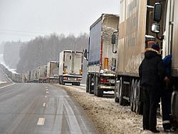 Пробка из фур длиной около 15 км скопилась на границе России и Белоруссии на трассе М1, основной магистрали, связывающей обе страны. Водителям-дальнобойщикам, следующим в Белоруссию, приходится тратить около двух дней на прохождение таможенного контроля, сообщает «Газета.ру». По словам председателя межрегионального профсоюза «Дальнобойщик» Валерия Войтко в очереди стоят как российские, так и иностранные водители. По сообщениям очевидцев, в очереди ждут все водители, особому досмотру подвергаются только российские.