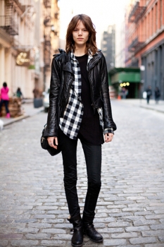Рок-стилистика в нынешнем сезоне как нельзя актуальна, а стиль панк стал одним из самых заметных трендов. Этот стиль подойдет смелым девушкам, которые хотят подчеркнуть свою индивидуальность и сильный характер. Для создания такого образа отдавайте предпочтение черному цвету, который, как известно, наиболее выгодно очерчивает фигуру, подходит практически всем и везде оказывается уместен. Неотъемлемые элементы образа в таком стиле — кожаная куртка-косуха, джинсы и массивная кожаная обувь. Отдавая предпочтение этому стилю, вы можете позволить себе простоту и некоторую небрежность: уместно будет смотреться минимум макияжа и аксессуаров, а также естественная прическа без долгой укладки.