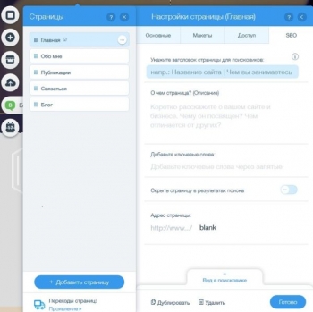 В процессе работы над сайтом изредка рекомендуется нажимать кнопку сохранить, чтобы внесенные изменения не пропали втуне. Нам показалось важным, что работа с конструктором происходит достаточно отзывчиво, ощущения, что работаешь с веб-приложением не возникает. Накидав необходимых элементов и правильно расположив их в нужных местах, отправляемся на вкладку «настройки», где делаем следующие вещи: