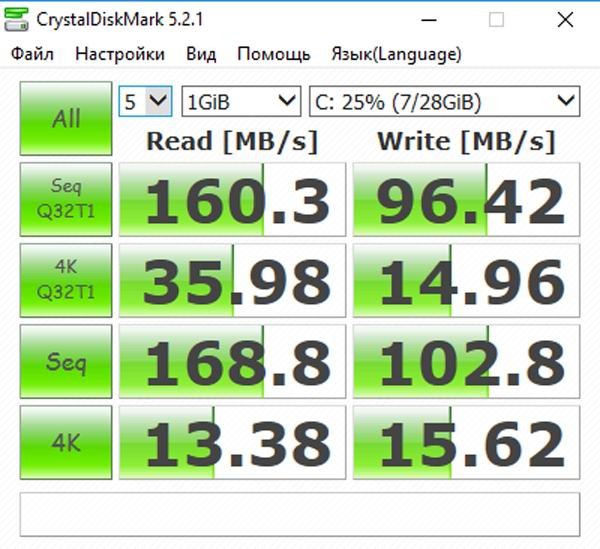 Также мы оценили возможности твердотельного накопителя, который в Prestigio Smartbook 141A заменяет жесткий диск. Тестирование проводилось в CrystalDiskMark, и результаты отлично видны на скриншоте. Параметры явно лучше в сравнении с обычными винчестерами, но до современных SSD все же не дотягивают, на основе чего делаем предположение, что под этой аббревиатурой в данном ноутбуке подразумевается просто флеш-память.