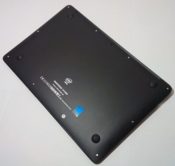 Камера, как ей и положено, в Prestigio Smartbook 141A находится над дисплеем, а оба микрофона вынесены на клавиатурную часть. На боковых торцах корпуса расположены интерфейсы, а задняя часть не несет в себе функциональной нагрузки. Снизу есть лишь ножки, винты крепления крышки, техническая информация и два динамика по бокам.