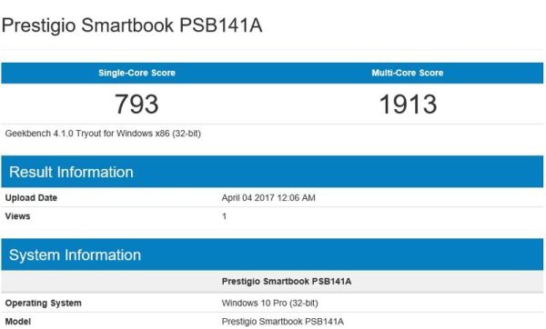 Ноутбук Prestigio Smartbook 141A тестировался в бенчмарке GeekBench, где в многоядерном режиме получил 1913 баллов, подтвердив тем самым свою принадлежность к мобильным ПК начального уровня. В игровых синтетических тестах лэптоп не проверялся, поскольку для современных игр он непригоден по целому ряду причин: во-первых, у него нет дискретной видеокарты, во-вторых, процессор получил пассивное охлаждение, что сделало лэптоп полностью бесшумным и одновременно повысило риск перегрева. Другими словами, тяжелыми играми его лучше не нагружать.