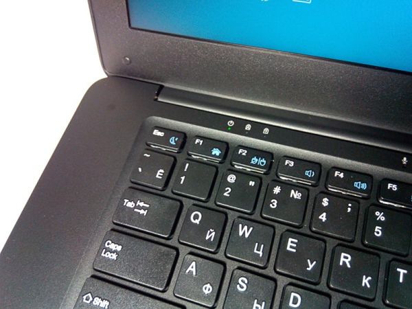 Внутренняя поверхность ноутбука исполнена из матового пластика, по всей видимости, устойчивого к царапинам. Клавиши сделаны из идентичного материала и имеют белую маркировку (синий цвет для дополнительных команд в сочетании с кнопкой Fn), и русские буквы по цвету совпадает с английскими. Это может не понравиться лишь тем, кто до сих пор по каким-то неведомым причинам не овладел слепым методом набора, так что за недостаток считать не будем.