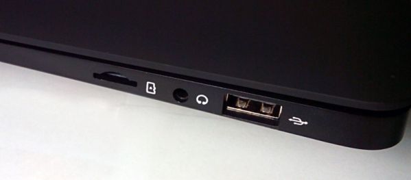 Место дислокации интерфейсов подобрано правильно – их вывели на боковые торцы, и они не мешают во время работы, находясь в то же время в легком доступе. Слева относительно клавиатуры видим порт USB, выход HDMI и разъем для зарядки, а справа находится еще один USB-порт, слот microSD и комбинированный вход под гарнитуру.