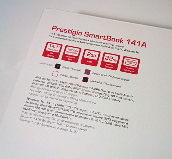 В принципе, для ознакомления с возможностями Prestigio Smartbook 141A можно изучить написанное на коробке из-под него или прочесть комплектную инструкцию, но мы же с вами живем в веке гаджетов, поэтому воспользуемся официальным сайтом, где тоже был найден подробный перечень возможностей компьютера. Приведенные ниже данные взяты с него, и расхождений с информацией с коробки или из инструкции нами не замечено.