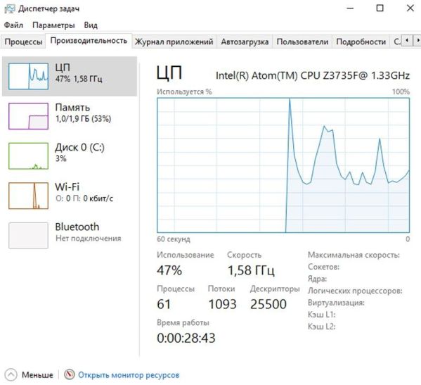 После первой загрузки ОЗУ была забита более чем наполовину, то есть под дополнительные программы остается менее 1 Гб RAM, а это очень мало, особенно для интернета. Подробнее об этом в следующем разделе.