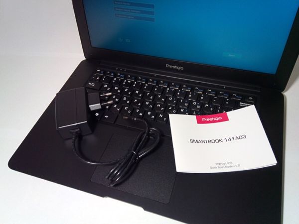 По умолчанию ноутбуку Prestigio Smartbook 141A не положены никакие дополнительные аксессуары, о чем производитель заявляет прямо, перечисляя все то, что можно найти внутри коробки. Здесь, помимо самого компьютера, есть лишь зарядное устройство и инструкция по эксплуатации, которая, кстати, определенно окажется очень полезной для тех, кто раньше не имел дело с ноутбуками и пользовался лишь стационарными ПК.