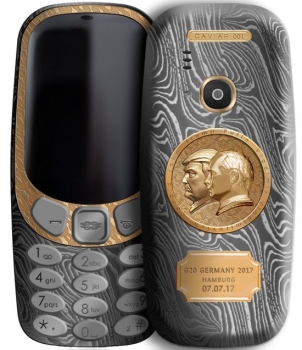 Супердорогая Nokia 3310 образца 2017 года отличается от стандартной версии всем, кроме электронной начинки. Корпус здесь изготовлен уже не из пластика, а из закаленного титана марки ВТ-32 с узором в стиле дамасской стали, плюс в оформлении использована эмблема саммита G20, на которой указана дата проведения мероприятия. Телефон Nokia 3310 от Caviar наверняка оценят диванные эксперты, разбирающиеся в политике и доказывающие это в комментариях и на форумах, потому как на тыльной стороне выгравированы портреты Дональда Трампа и Владимира Путина. Они, кстати, имеют двойное золотое покрытие 999 пробы.