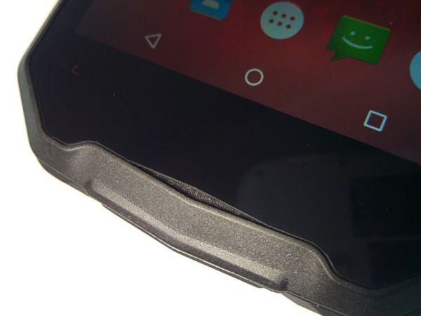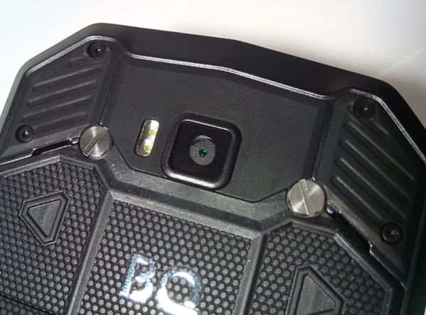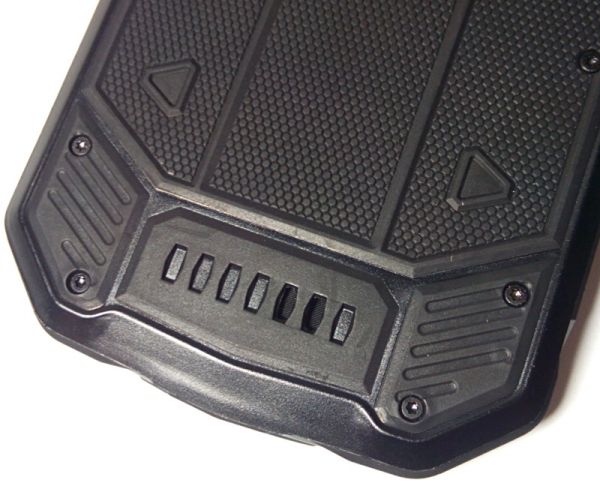 В результате имеем весьма интересный дизайн лицевой панели, но взгляд привлекает именно панель задняя: как раз здесь брутальность аппарата проявляется на 146% за счет оригинальной текстуры, множества винтов и нарочито грубых форм. Пластик, из которого изготовлен корпус, напоминает оный на передней панели внедорожника Renault Duster, а тот сразу производит впечатление монолита. На торцах мобильника текстуры нет, но и они оформлены в общей мужской стилистике. Лицевая панель очень активно собирает отпечатки пальцев и плохо очищается от них (всему виной защитная пленка), а маркость задней крышки сведена к нулю – она вообще не пачкается.