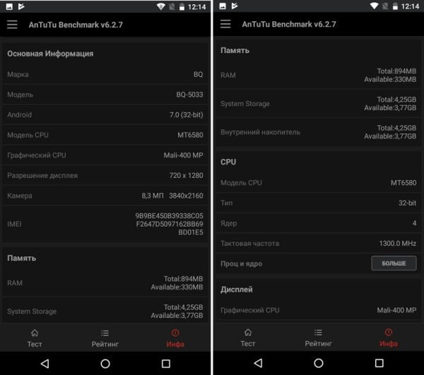 После первой загрузки в BQ Shark доступно порядка 3,75 Гб встроенной памяти из 8 Гб, а из 1 Гб памяти оперативной доступно около 302 Мб. Тяжелым программам, таким как навигаторы или браузеры, такого объема свободной RAM будет маловато.