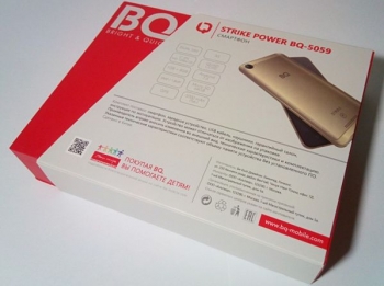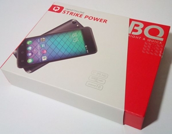 Смартфон BQ Strike Power встретит потенциального покупателя в коробке из прочного картона, оформленного в общем стиле данной марки. Упаковка выполнена в сером, белом и красном цветах с золотым тиснением и позволяет оценить внешний вид гаджета еще до вскрытия.