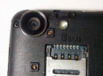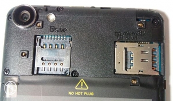 Strike Power располагает съемной задней крышкой, под которой расположены три отдельных слота – два microSIM и один microSD. Горячая замена карточек не поддерживается: даже если поменять их при включенном телефоне, они не активируются без перезагрузки. У смартфона есть три кнопки управления под сенсорным экраном, а над ним расположены фотокамера без подсветки, закрытый сеточкой разговорный динамик и сенсоры приближения и освещенности.