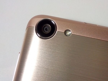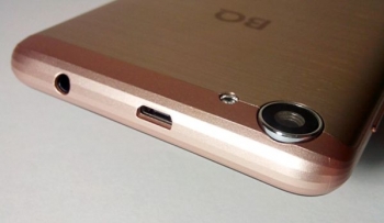 Правый торец корпуса отдан под кнопки включения и регулировки громкости, снизу у мобильника есть хорошо заметный микрофон, а наверху помещены вход под наушники порт microUSB. Задняя панель включает сеточку основного динамика в нижней части и основную фотокамеру с одинарной светодиодной вспышкой.