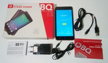 BQ Strike Power располагает расширенным по нынешним меркам комплектом поставки: в дополнение к традиционным аксессуарам в виде дата-кабеля и зарядного устройства приложены наушники вакуумного типа. На лицевую панель самого смартфона нанесена защитная пленка.