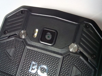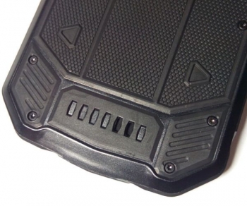 В результате имеем весьма интересный дизайн лицевой панели, но взгляд привлекает именно панель задняя: как раз здесь брутальность аппарата проявляется на 146% за счет оригинальной текстуры, множества винтов и нарочито грубых форм. Пластик, из которого изготовлен корпус, напоминает оный на передней панели внедорожника  Renault Duster, а тот сразу производит впечатление монолита. На торцах мобильника текстуры нет, но и они оформлены в общей мужской стилистике. Лицевая панель очень активно собирает отпечатки пальцев и плохо очищается от них (всему виной защитная пленка), а маркость задней крышки сведена к нулю – она вообще не пачкается.