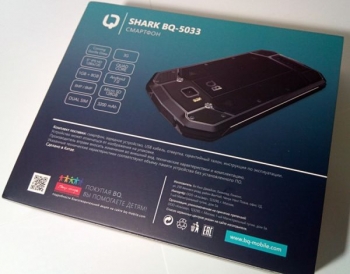 Коробка с BQ Shark оформлена очень красиво – присутствует изображение самого смартфона, а общий антураж намекает на защиту от влаги. Экстерьер моноблока можно рассмотреть со всех сторон, и в дополнение к рендерам добавлены основные спецификации и перечень аксессуаров из комплекта поставки.
