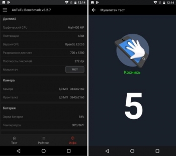 Зернистостью и, наоборот, замыленностью экран не страдает, изображение прорисовывается на достаточно высоком уровне качества. Тач-слой реагирует на 5 одновременных прикосновений, но не распознает касания мокрыми руками и перчатками, хотя это тоже не было заявлено производителем.
