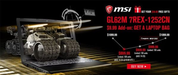 По умолчанию MSI GL62M 7REX-1252CN стоит $1100, но в период с 14 по 20 августа включительно каждый день первые 100 его экземпляров оцениваются в $900, а еще 150 – в $960. Если не успели, не беда: после 20 августа еще 150 ноутбуков получится купить за $1000 по промо-коду «MSI1252 », после чего его цена вернется к прежним $1100.
