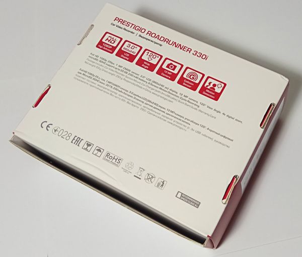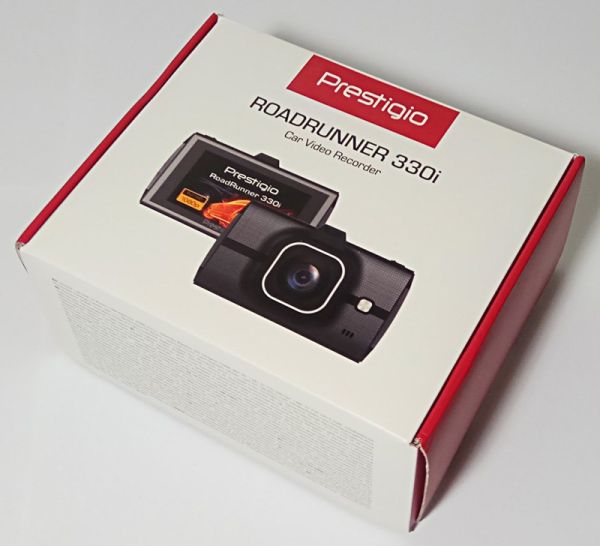 Prestigio Roadrunner 330i поставляется в традиционной довольно компактной коробке из картона, исполненной в белом и красном цветах. Верхняя часть сразу же встречает потенциального покупателя рендером самого регистратора с обеих сторон – видно и оптику, и экран, и общие черты дизайна. Это однозначный плюс.