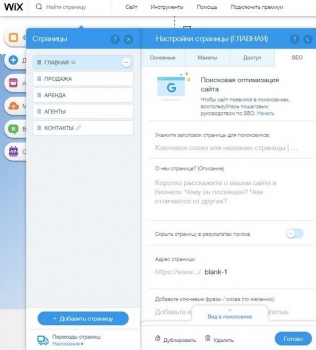 В режиме редактирования сайта в пункте меню «Страницы» будет многоточие — на него следует нажать и приступать к заполнению. На вкладке «SEO» есть метатеги Title и Describtion. В первый вводится не более 70 символов, во второй — 160. Это важные метатеги, их нужно обязательно заполнить в соответствии с планом продвижения сайта. Еще Wix предоставляет возможность заполнить поле Keywords, но в последнее время поисковые системы обращают внимание на это поле крайне мало, так что его можно оставить незаполненным. Кроме страниц, доступных из меню, в Wix имеются страницы с записями. Метатеги необходимо заполнить и для них тоже.