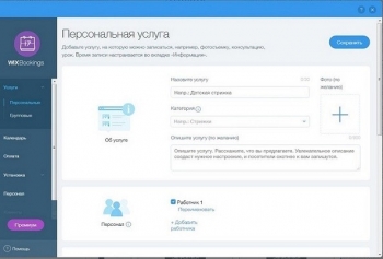 Здесь можно сразу же придумать название услуги, выбрать ее категорию, установить время ее оказания и ее длительность, назначить цену, выбрать платная услуга будет или нет, на чьей территории происходить (у вас, у клиента или в ином месте), выбрать фото и назначить определенного сотрудника, который будет оказывать услугу.