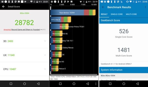 Возможности BQ Strike Selfie Max в плане вычислительной мощности тестировались в трех бенчмарках – AnTuTu, GeekBench и Quadrant Standard, и итоговые результаты не очень впечатляют. В этот смартфон так и просится более мощный процессор, хотя бы с двухъядерной видеокартой, но, увы. Производительности Selfie Max с лихвой хватает для большинства повседневных задач, в том числе и для потокового HD-видео в навигации, а также для работы с документами, но если вы ищете игровое решение, то данный смартфон вам точно не подойдет. Под нагрузкой нагрев корпуса заметен, но не критичен.
