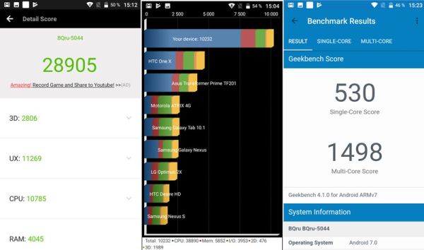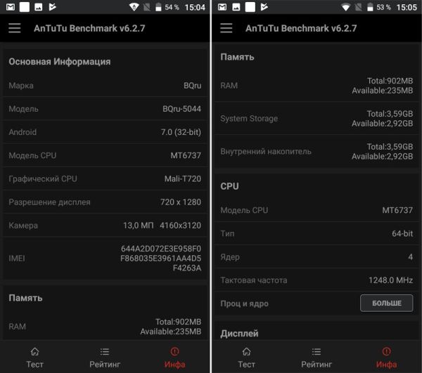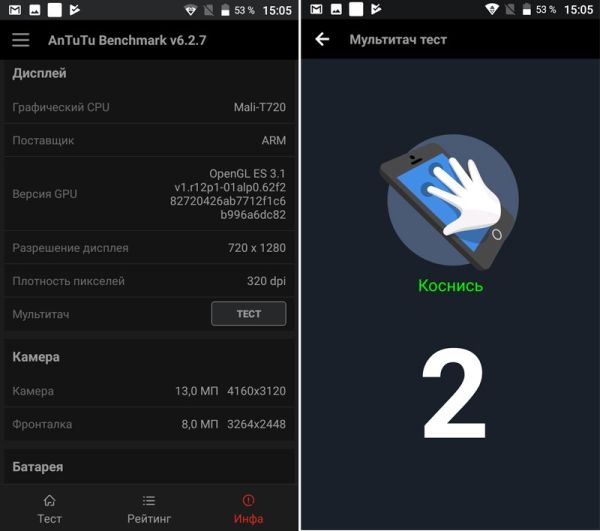 В синтетических тестах этот недостаток проявляется не так сильно: в AnTuTu моноблок получил чуть больше 28900 баллов, в Quadrant Standard – 10232 балла, а GeekBench поставил его процессору 530 и 1498 баллов в одноядерном и многоядерном режимах. Очень хорошо показала себя встроенная в процессор видеокарта: на смартфоне удалось поиграть в Танки, пусть и на минимальных настройках, но почти без лагов. Нагрев мобильника есть, но он некритичный, перегревов тут точно можно не ожидать.