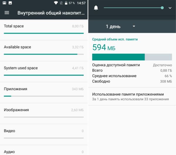 Наличие бесполезного рекламного ПО приводит к наличию свободных 308 Мб ОЗУ из общих 1024 Мб, а также 3,32 Гб из 8 Гб ROM, так что памяти в телефоне и правда очень мало для 2017 года.