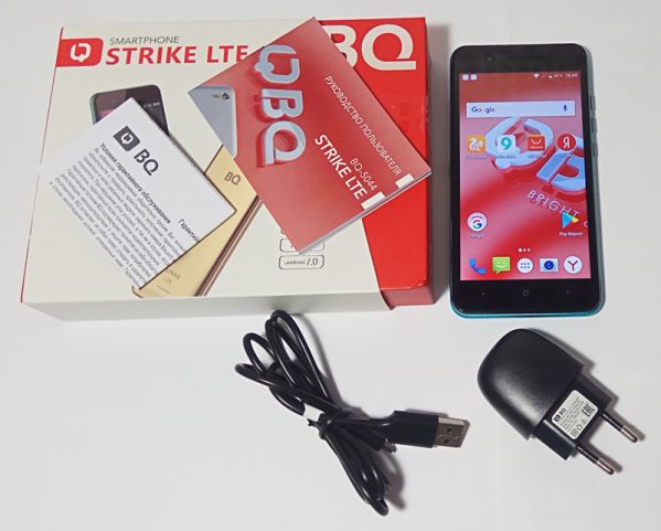 Комплектация BQ Strike LTE, на самом деле, очень скромная, даже на ускоренную зарядку шансов не оставили, положив в комплект сетевое ЗУ с силой тока 1 ампер. Помимо него, в коробке были обнаружены инструкция, гарантийный талон и дата-кабель для зарядки и синхронизации с ПК. Пленка на экран тоже есть – она заранее нанесена на лицевую панель.