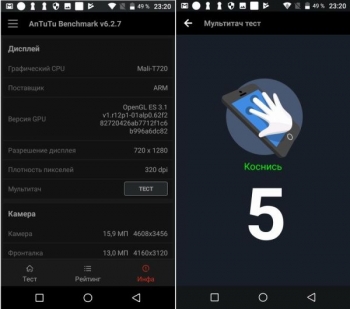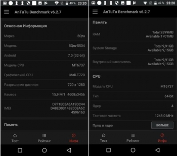 Возможности BQ Strike Selfie Max в плане вычислительной мощности тестировались в трех бенчмарках – AnTuTu, GeekBench и Quadrant Standard, и итоговые результаты не очень впечатляют. В этот смартфон так и просится более мощный процессор, хотя бы с двухъядерной видеокартой, но, увы. Производительности Selfie Max с лихвой хватает для большинства повседневных задач, в том числе и для потокового HD-видео в навигации, а также для работы с документами, но если вы ищете игровое решение, то данный смартфон вам точно не подойдет. Под нагрузкой нагрев корпуса заметен, но не критичен.
