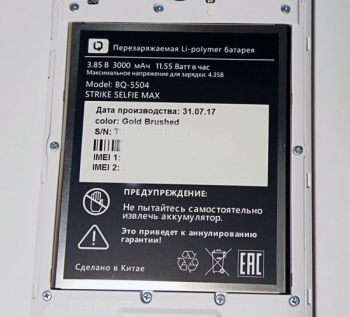 Система питания BQ Strike Selfie Max – это литий-полимерная несъемная батарея на 3000 мАч. В режиме только разговоров по сетям GSM смартфона хватает на два полных дня, и в конце второго еще остается 10-15% заряда.