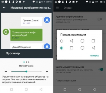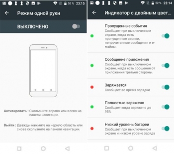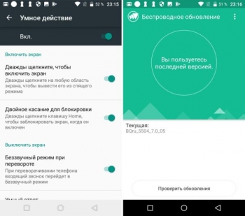 Смартфон дополнен поддержкой жестов, например, включением по двойному прикосновению к экрану, и это очень удобно, плюс можно настраивать масштаб отображения и виртуально превращать HD-экран в Full HD. Дополнительно есть функция настройки порядка расположения наэкранных клавиш управления.