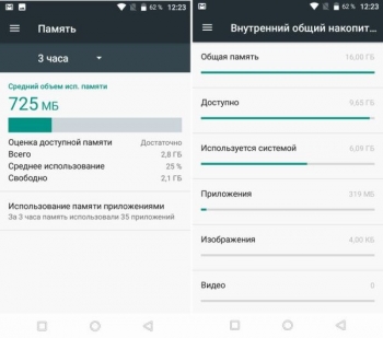 После первого запуска пользователю доступно 2,1 Гб оперативной памяти из 3 Гб, а также 9,65 Гб из 16 Гб ROM. Удаление стороннего софта освобождает еще порядка 550 Мб ROM.